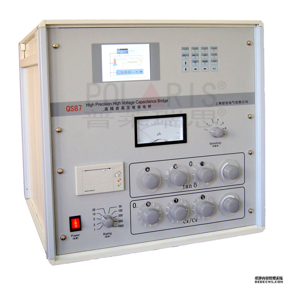 QS87型高精密高压电容电桥主要采用电流比较仪的原理,具有操作方便可靠、测量精度高、读数位数多、线性度好,不受环境湿度影响,仪器显示采用大屏幕 TFT,可显示电容值 Cx、介损值tgδ、试验电压Upk/√2 、电感量Lx、品质因数Q、测试电流Ix、材料的介电常数ε、测试电源频率fx、视在功率S、有效功率P、无功功率Q等,它不仅能测电容器的电容量、介损量,还能测量电抗器的电感量和Q值及固体材料和液体材料的介质损耗和介电常数,还有前时钟的显示,具有精度高、稳定性好等优点,操作方便、用途广泛。它在测量上具有很高的比率精度和稳定性,这是一般西林电桥 、高压介损仪不能达到的。适宜于在高电压下测量电力电缆、高压套管、电力电容器、 电抗器、互感器等高压电力设备的电容量及损耗角正切值tgδ,以及各种固体或液体绝缘材料的介电常数(ε)及介损值tgδ,也可测量高压变压器或电压互感器的比差和角差。电桥可外接电流互感器以扩大量程,测量大 的电力 电容 器 时本电桥为四端测量具有引线补偿装置,使测量精度提高,消除接线电阻引起的附加误差。本电桥还可测量电抗器的电感量及Q值。量程扩展器(供选购)能使主桥体的电容比从1000:1扩大到106:1。